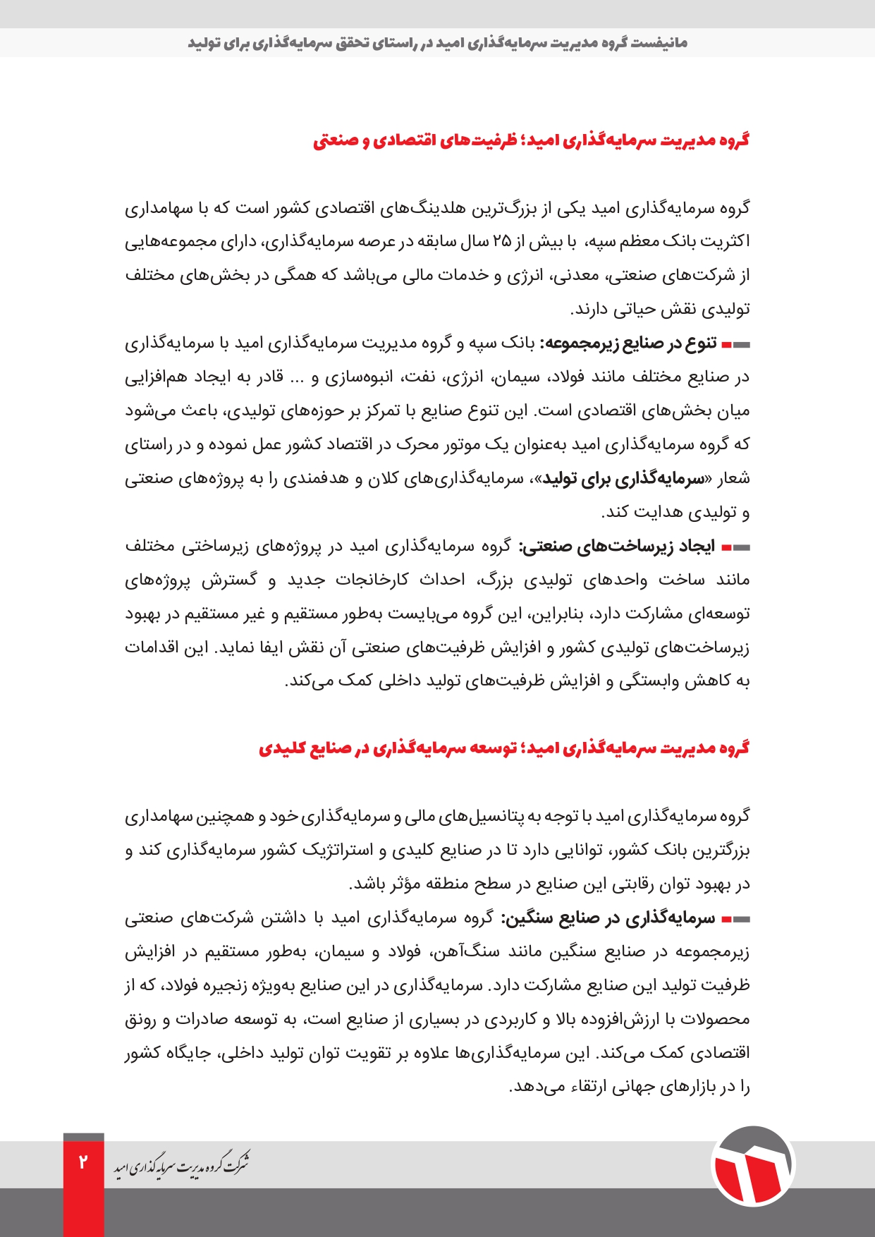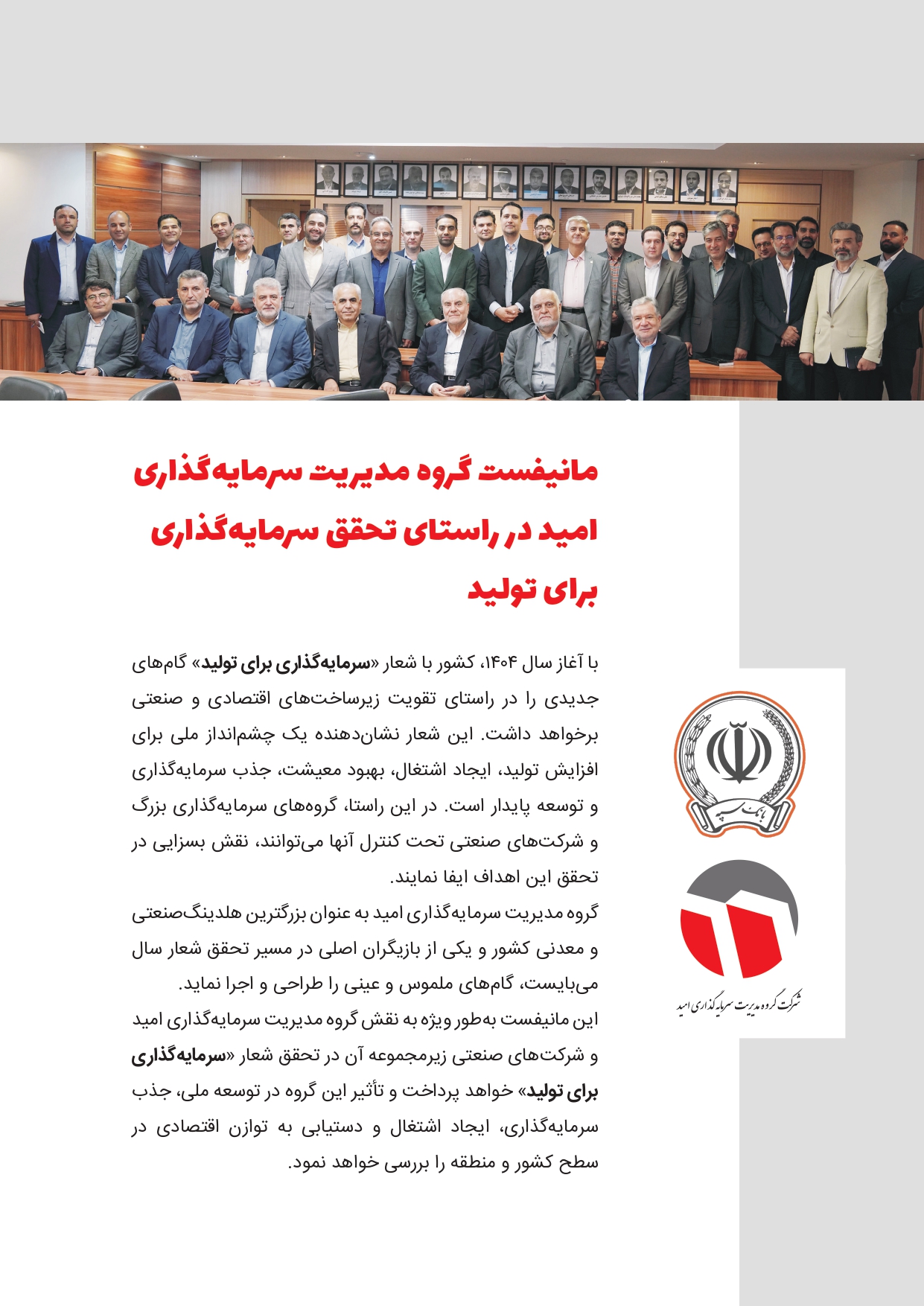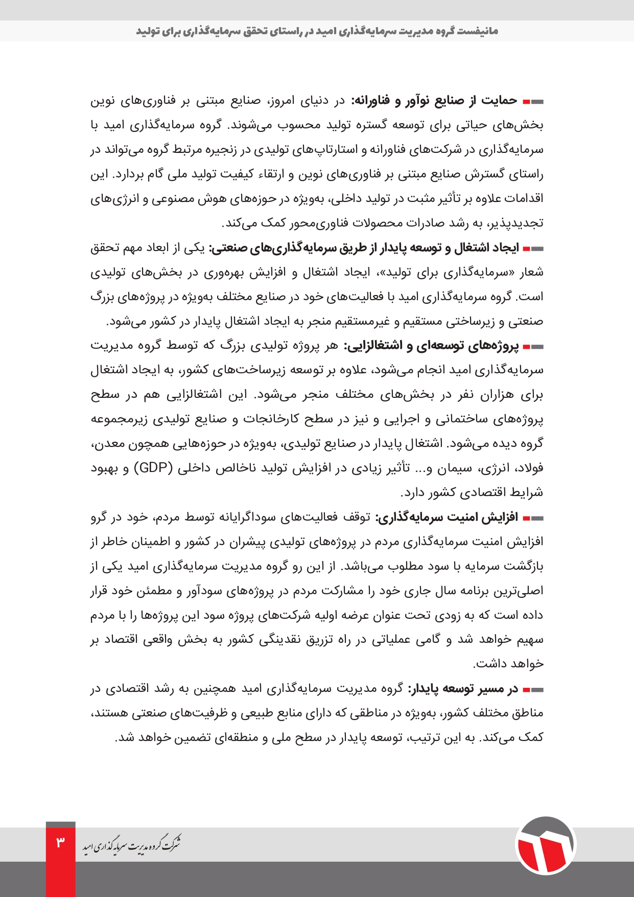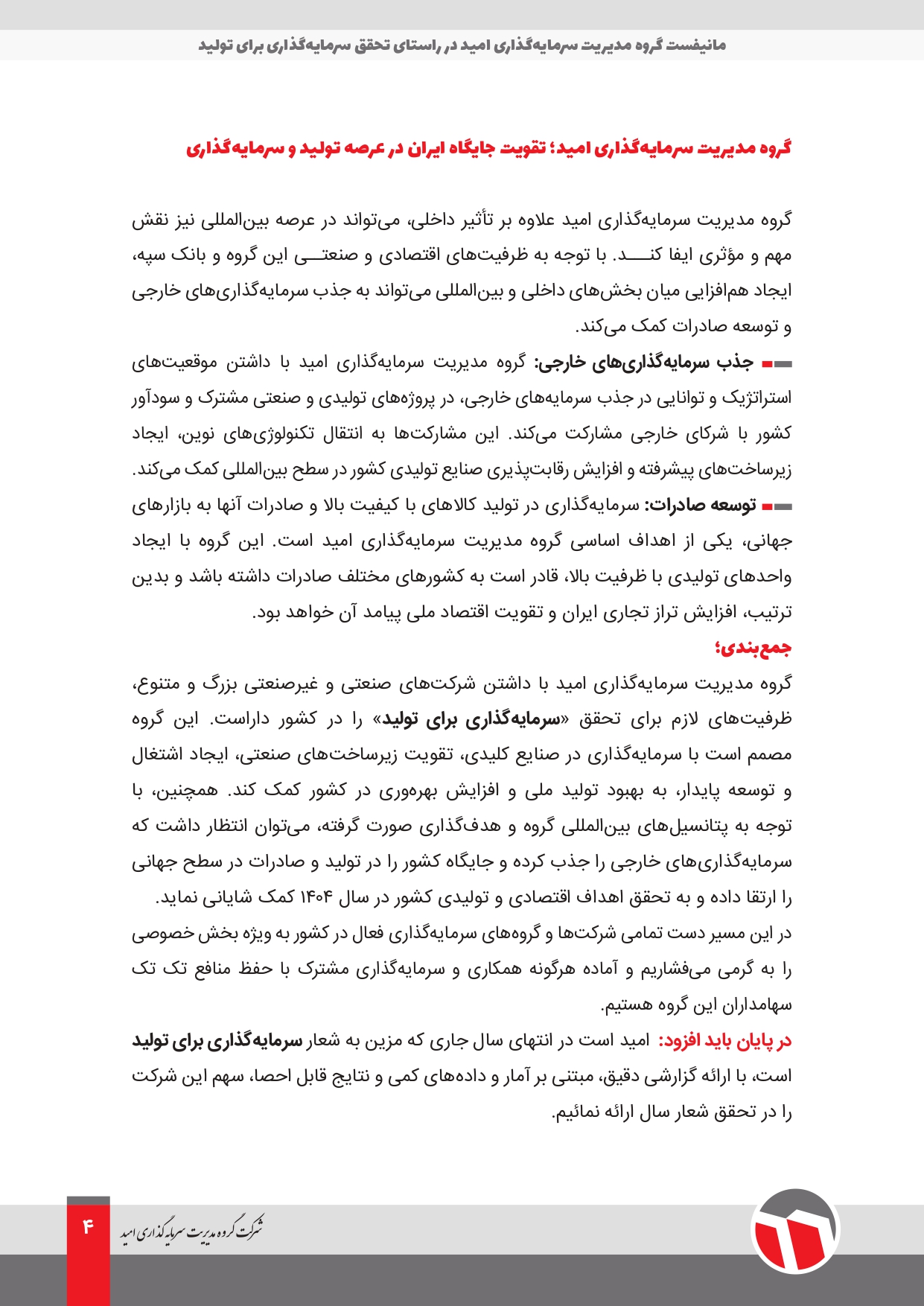 اخبار و رویدادها 1404-01-23 modir به گزارش روابط عمومی شرکت گروه مدیریت سرمایه گذاری امید، این هلدینگ در راستای تحقق «سرمایه گذاری در تولید»، مانیفست اجرایی خود را به شرح ذیل منتشر کرد.